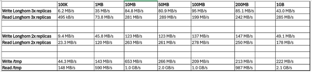 Longhorn 2x replica: same as 3x, but data is only replicated to 2 nodes. This is less data replication/availibility, but because there will be less data copying, acknowledging, theretically, it should perform better.