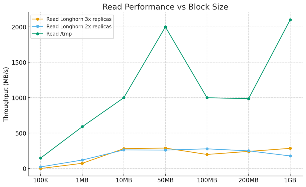 When it comes to Longhorn, it depends heavily on the network performance and bottlenecks, like any other storage provider of this architecture (Cephs Rook is on example).
